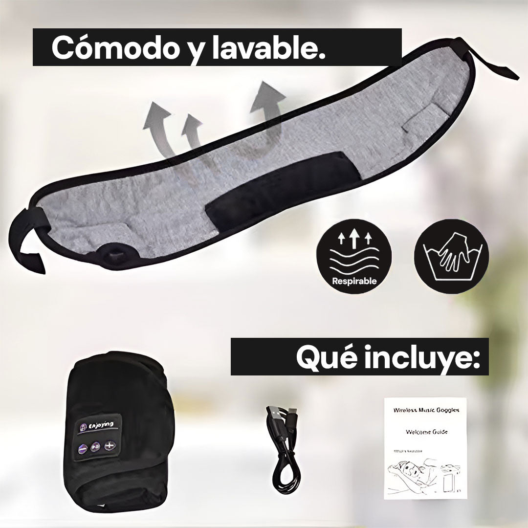 Bloquea el ruido y relájate con tus sonidos favoritos. Perfecto para meditar, viajar o disfrutar un sueño profundo. Lavable y cómodo, este antifaz es tu aliado ideal.