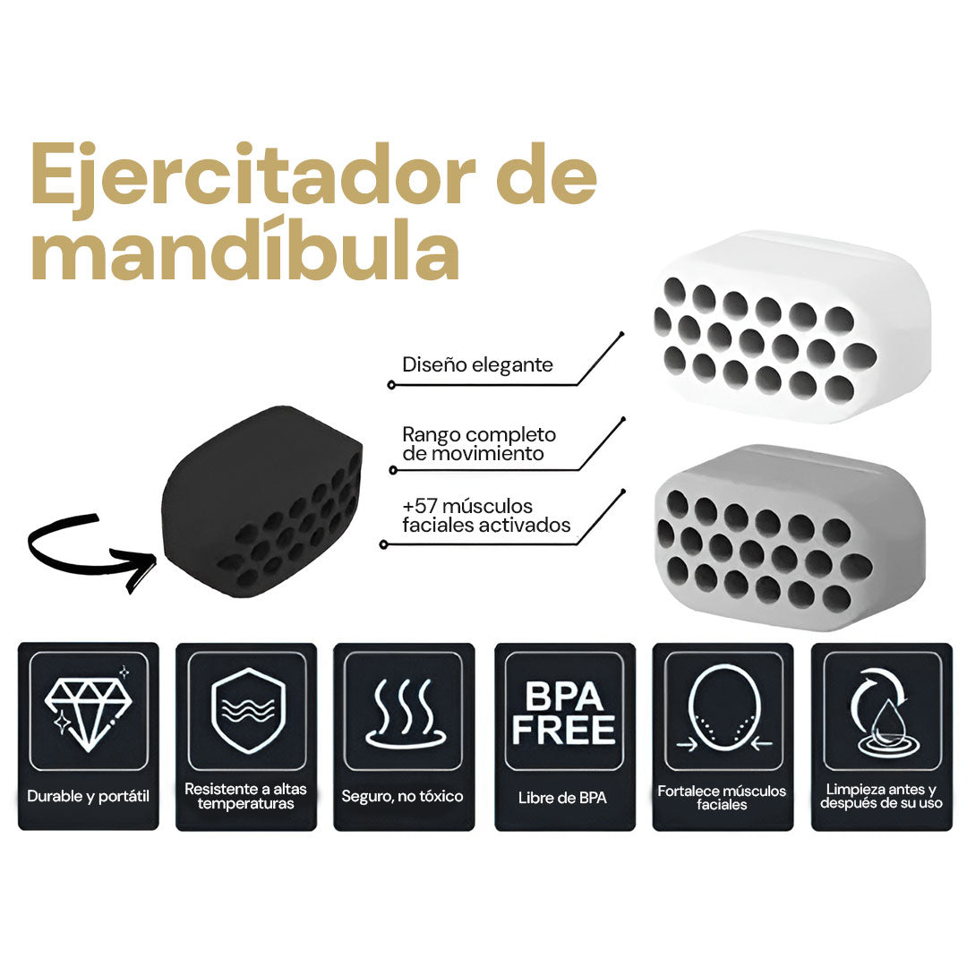 Con solo 5 minutos de uso diario. Este ejercitador actúa en los músculos maseteros, ayudando a reducir grasa facial y mejorar el tono del rostro