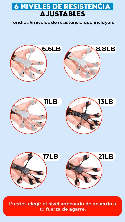Con nuestro entrenador de agarre ajustable en 6 niveles, podrás mejorar tu fuerza y resistencia en cada ejercicio