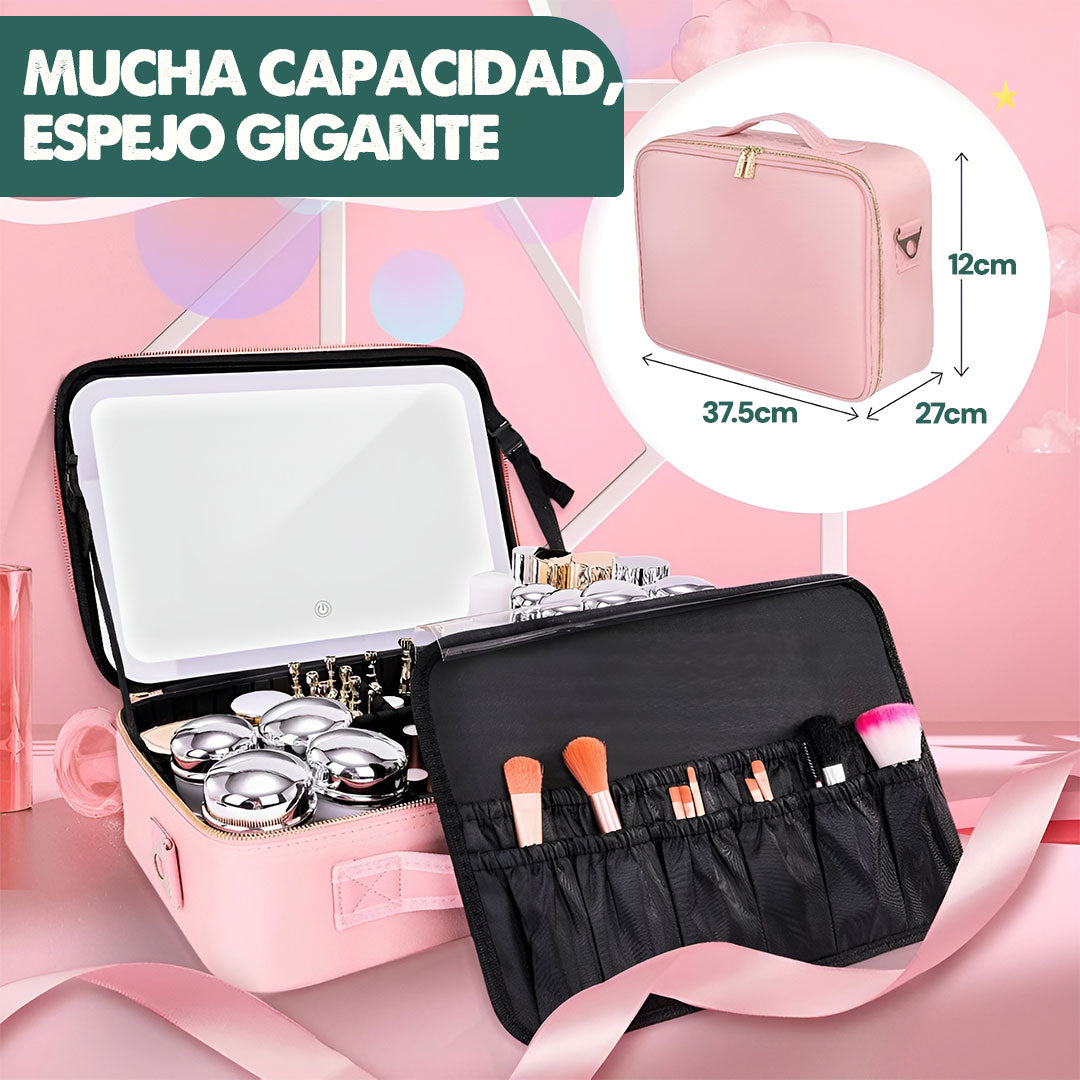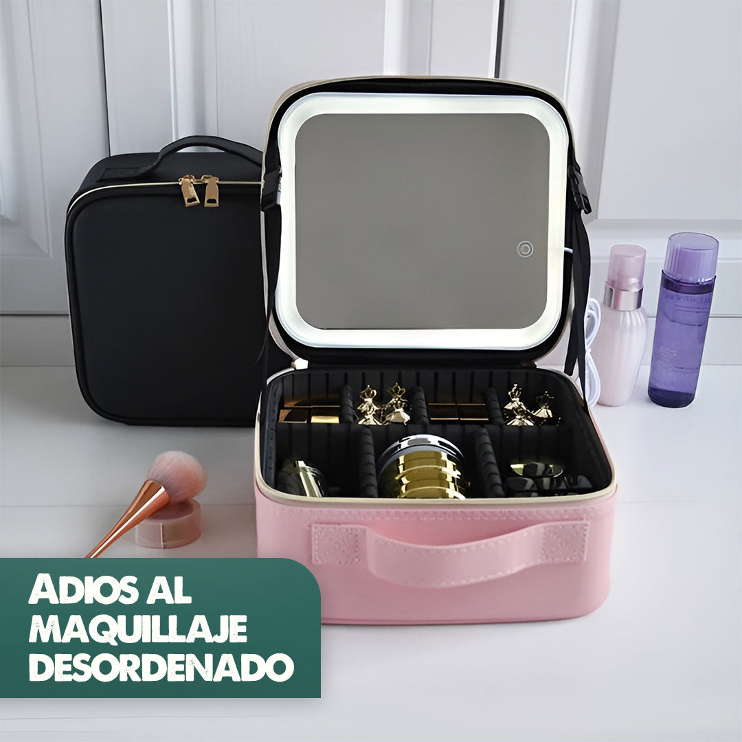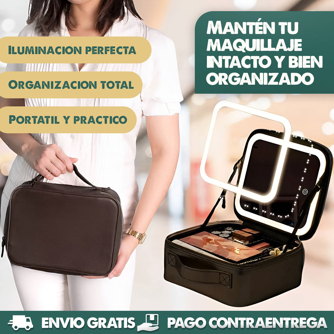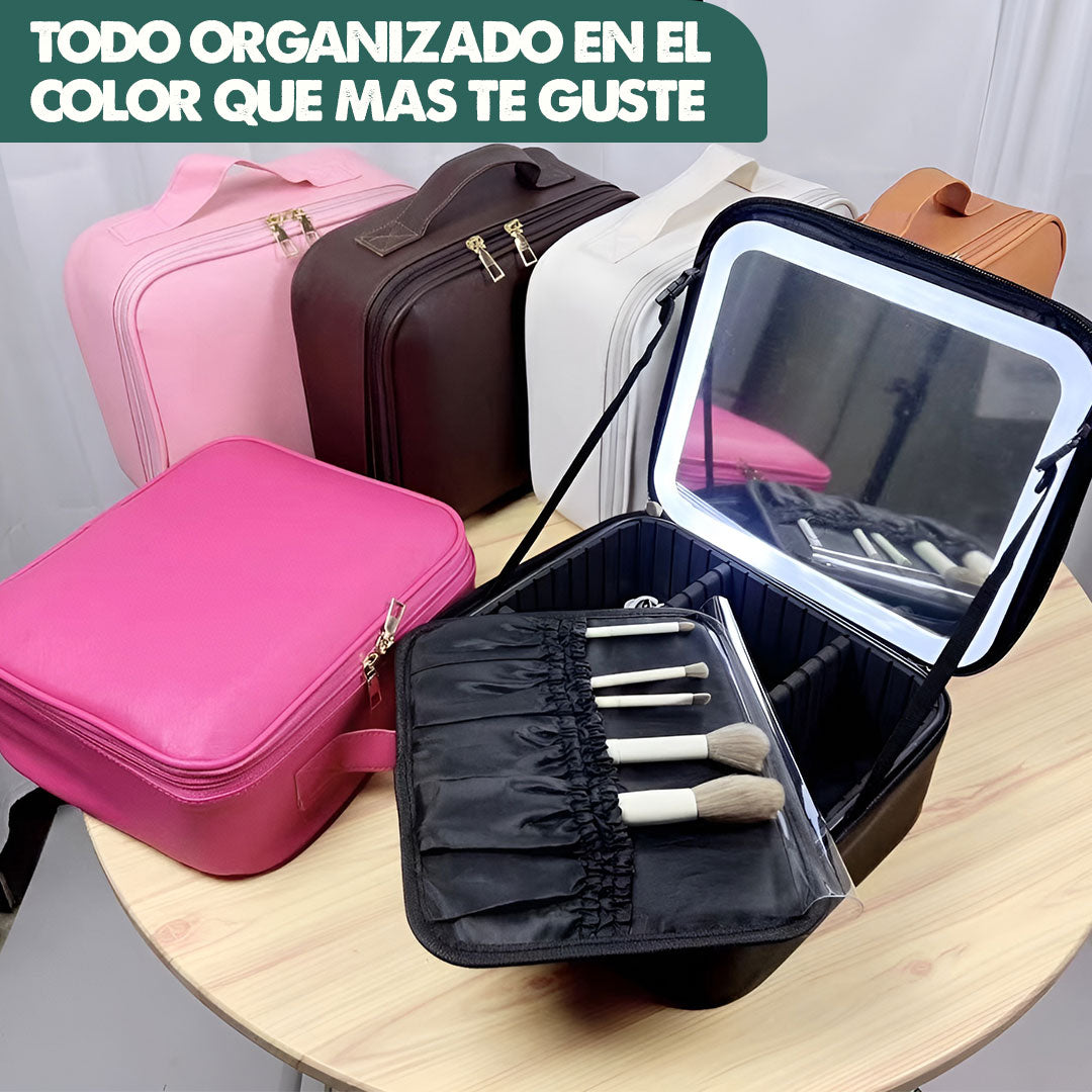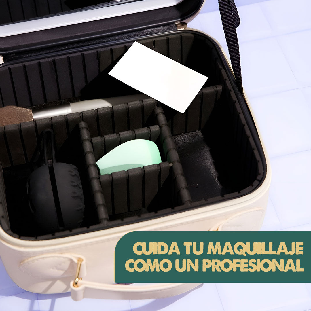 Con este organizador de maquillaje premium. Su espejo iluminado, divisiones personalizables y su correa ajustable te permiten llevar tu maquillaje a cualquier parte con total comodidad