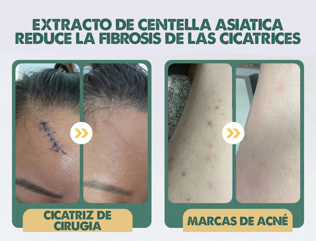 Extracto de Centella asiática – Conocida como el “Rey de las plantas reparadoras de la piel”, sus compuestos activos —incluidos el ácido madecásico y el asiaticósido— estimulan de manera efectiva la síntesis de colágeno y reducen la fibrosis del tejido cicatricial. Numerosos estudios clínicos han demostrado su gran capacidad para mejorar cicatrices estructurales como cicatrices quirúrgicas, marcas de acné y estrías.