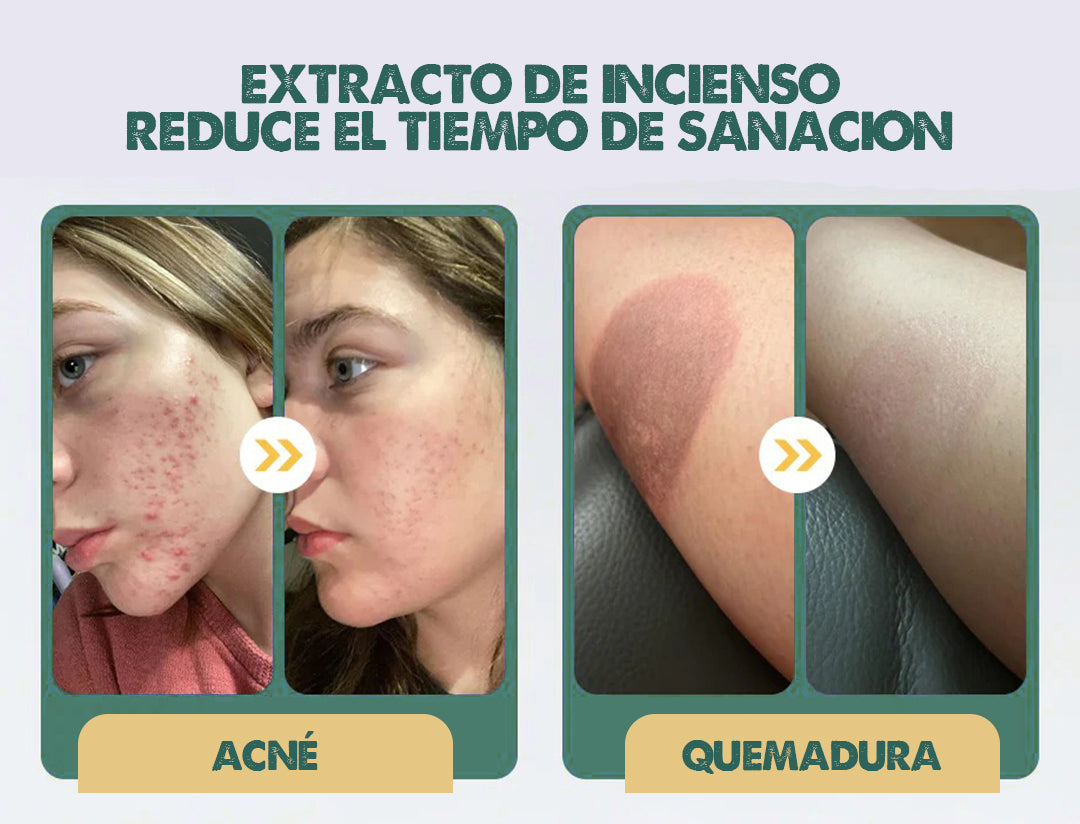 Extracto de incienso (Frankincense) – Sus compuestos activos, como el ácido boswélico, poseen fuertes propiedades antioxidantes que inhiben el crecimiento cutáneo anormal (como los skin tags) y protegen el tejido dañado del daño de los radicales libres. También ayuda en el metabolismo de los pigmentos, acelerando el desvanecimiento de cicatrices. El uso prolongado ayuda a uniformar el tono de la piel y reduce el oscurecimiento y endurecimiento de las cicatrices.