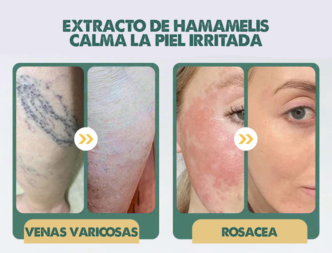 Extracto de hamamelis (Witch Hazel) – Rico en polifenoles naturales como el ácido tánico y las proantocianidinas; calma la inflamación microvascular, aporta hidratación profunda, suaviza la piel irritada y ayuda a reducir el dolor y la hinchazón causados por la dilatación venosa.