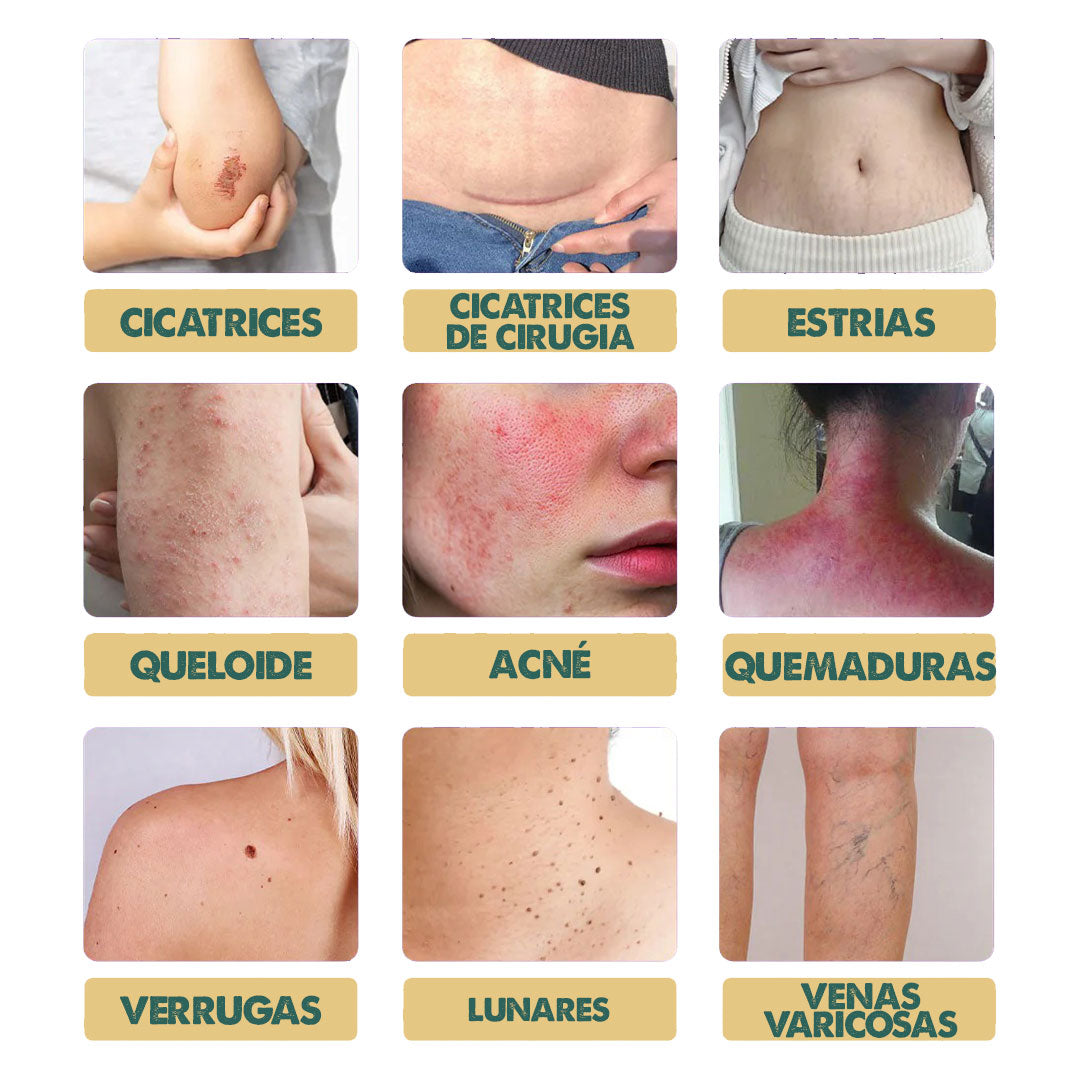 Este producto fue desarrollado en colaboración con dermatólogos certificados por la junta, garantizando un cuidado de la piel de calidad profesional en cada aplicación. Su fórmula única está diseñada para reducir visiblemente la apariencia de cicatrices nuevas y antiguas, incluidas cicatrices quirúrgicas, estrías, queloides, cicatrices de acné, quemaduras, verrugas, skin tags y venas varicosas.