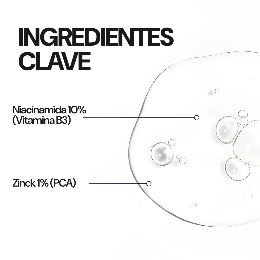 Composición Activa: 10% Niacinamida (Vitamina B3) y 1% Zinc.